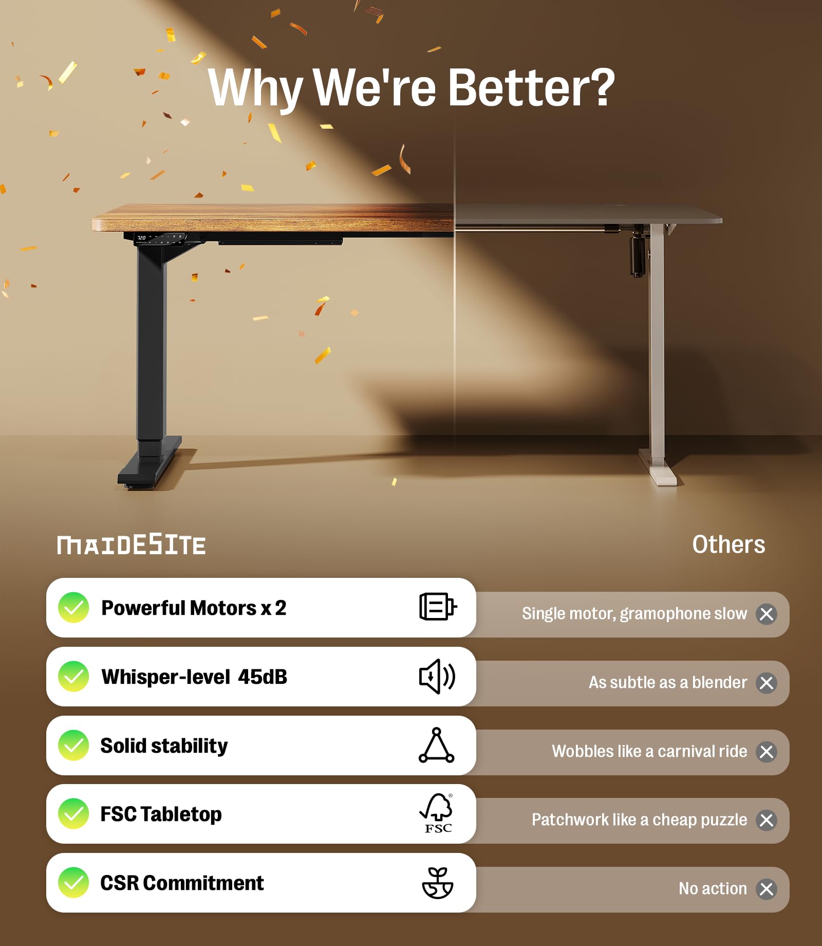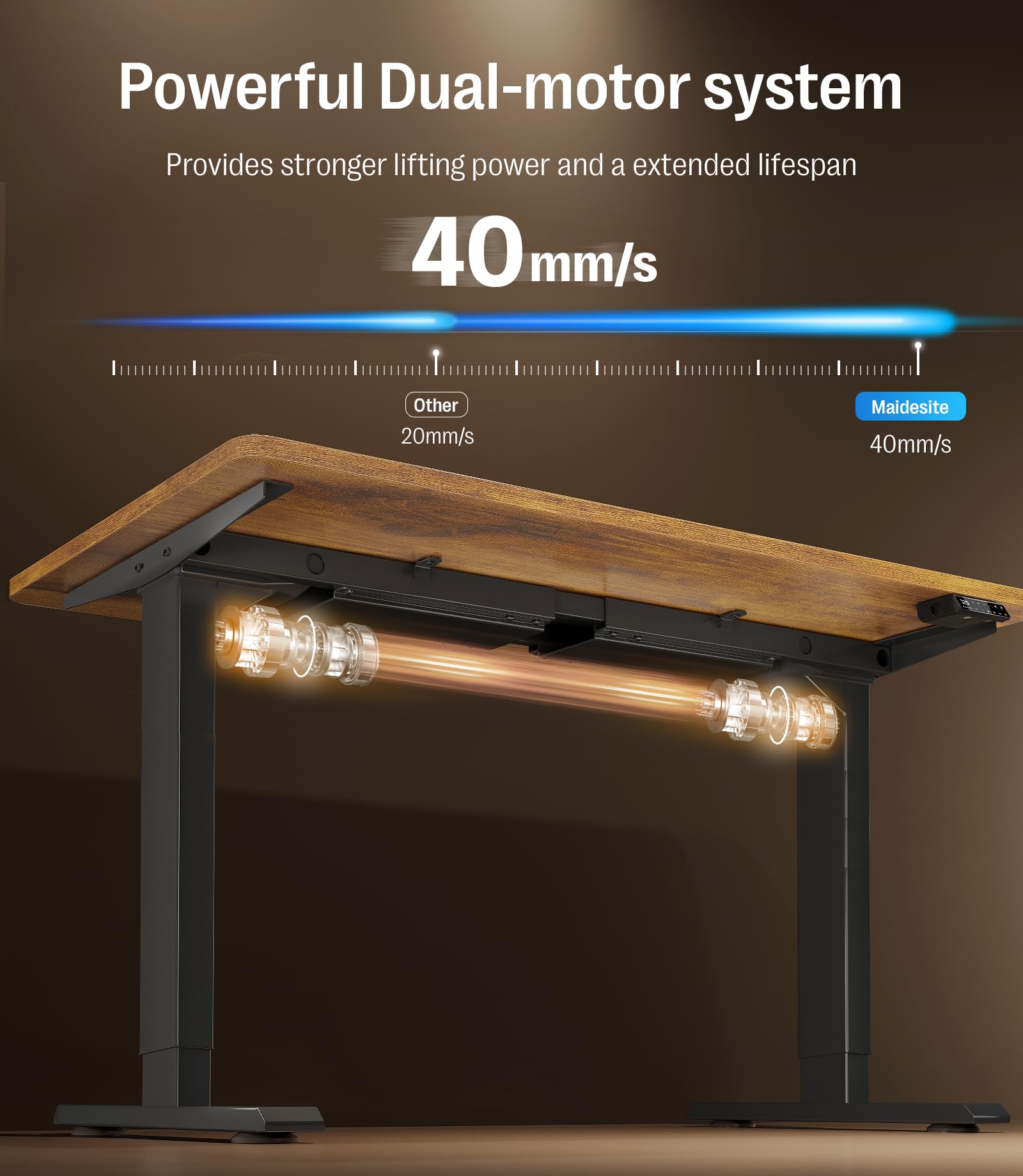 - Führendes Zwei-Motoren-System - Der Maidesite S2 Pro Plus verwendet die Spitzenqualität der Branche bei seinen hochwertigen Doppelmotoren, mit einer Tragfähigkeit von bis zu 160 kg und unterstützt Höhenverstellung zwischen 72-120 cm. Mit einer schnellen Hubgeschwindigkeit von 32 mm/s und einem geräuschlosen Betrieb (unter 45 Dezibel) schafft er Ihnen eine ruhige, effiziente Arbeits- und Lebensumgebung.