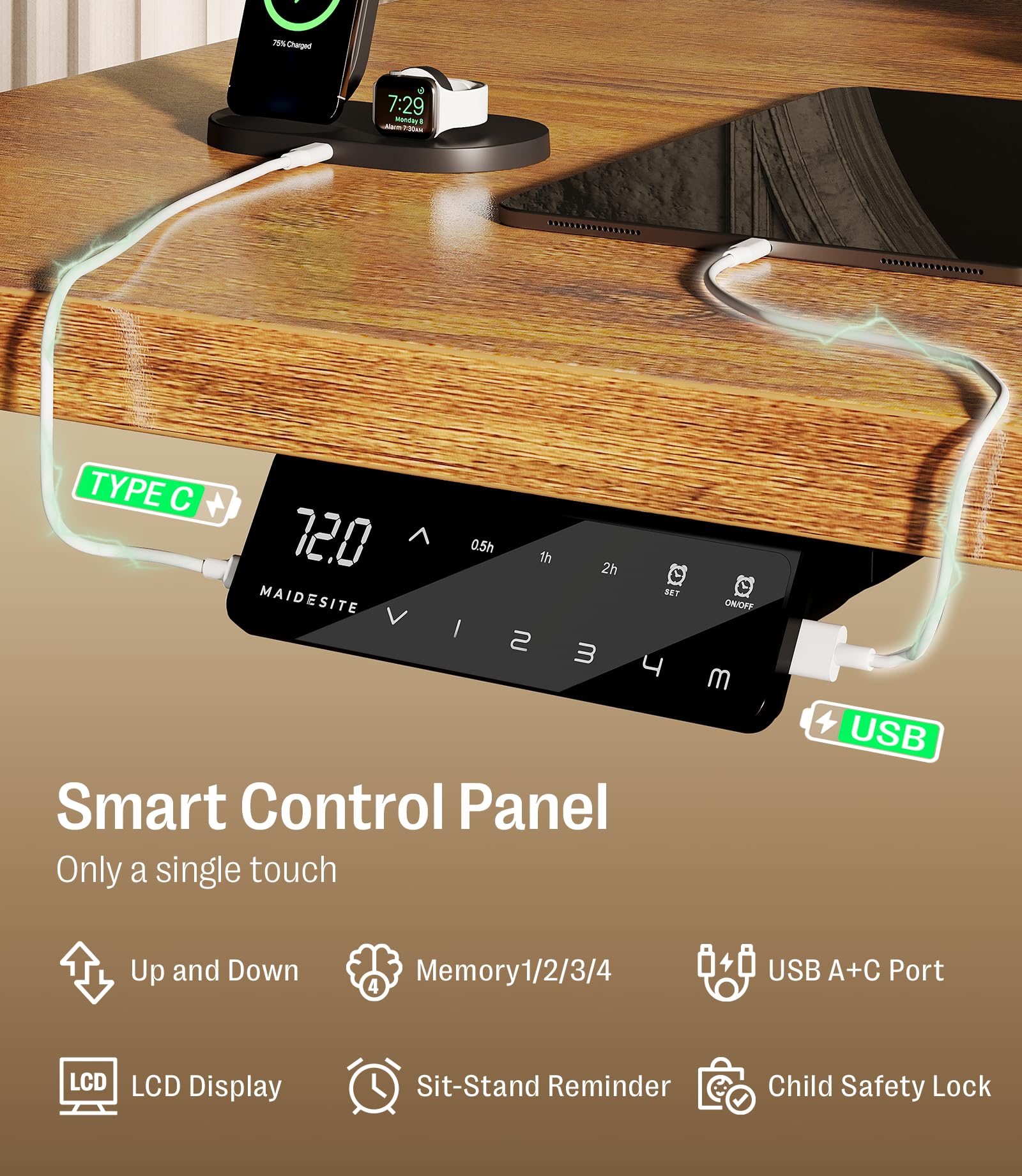 - USB-C-Schnellladeanschluss - Das im höhenverstellbaren Schreibtisch-Controller integrierte Typ-C-Schnelllademodul ist 100 % schneller als herkömmliche Schnittstellen. Identifizieren Sie auf intelligente Weise den Strombedarf verschiedener Geräte. In Zusammenarbeit mit dem versteckten Kabelmanagement-Steckplatz auf dem Schreibtisch entwickelt, ermöglicht es "kabellosen Desktop und unsichtbare Stromversorgung".