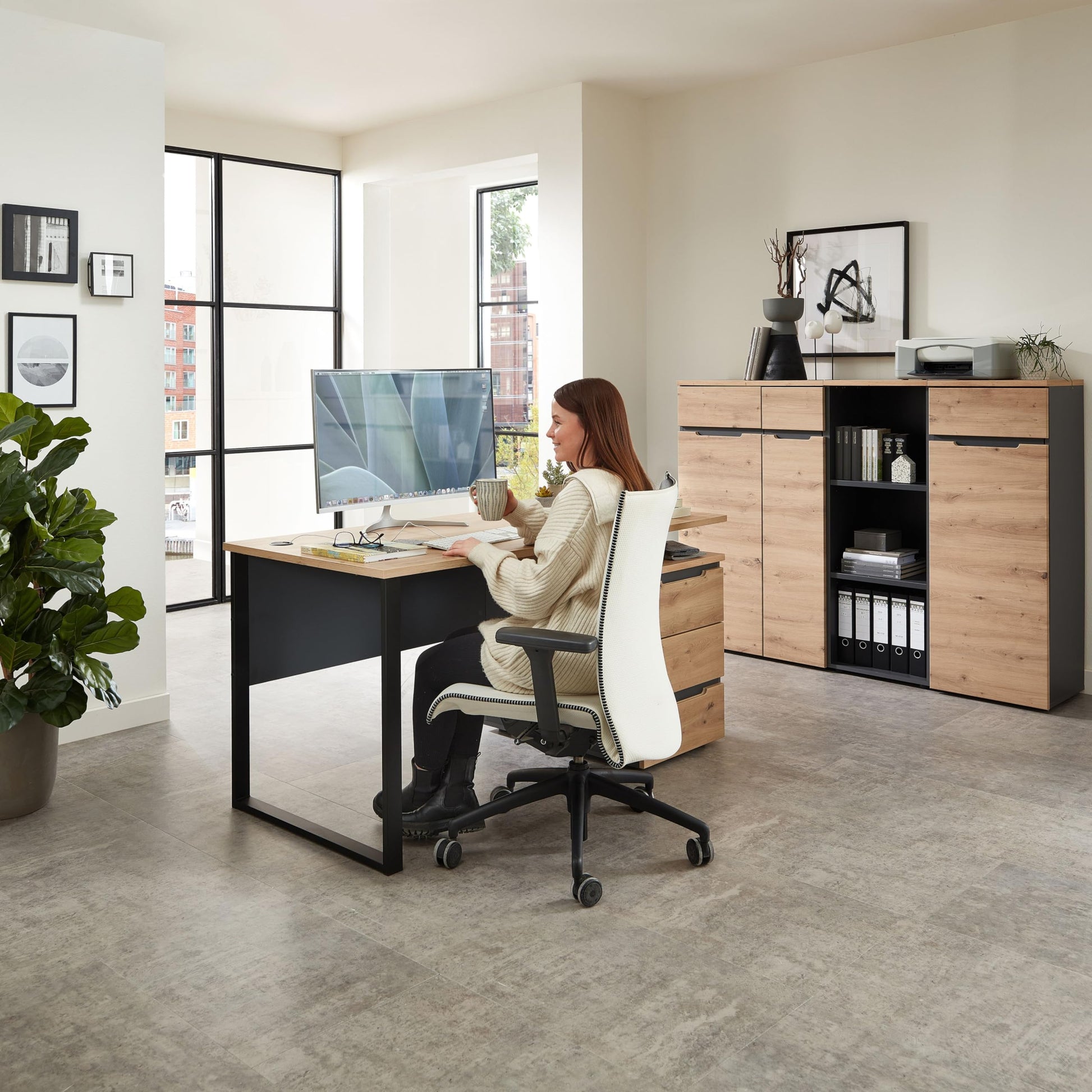 - MODERN - Der Schreibtisch besticht durch sein modernes Design mit einem Metallgestell in mattem Schwarz und einer Tischplatte in Artisan Eiche. Diese Kombination verleiht ihm eine zeitgemäße Ästhetik.
